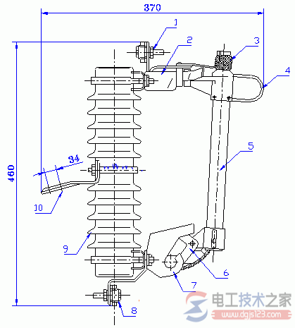 有關跌開式熔斷器主接線圖的具體規定,跌開式熔斷器的安裝應符合某些規定,包括與垂線的夾角、相間距離、對地面距離,熔絲位置應安裝在消弧管中部偏上等。